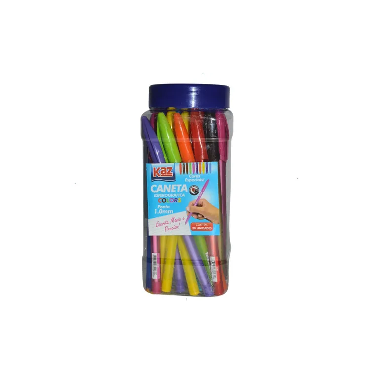 A caneta esferográfica Kaz proporciona uma escrita macia, com secagem rápida. Corpo e tampa acompanham a cor da tinta.