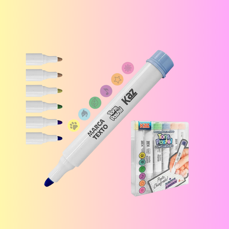 Pincel marca texto 6 cores com carimbo Kaz